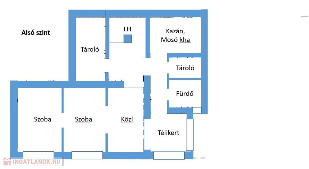 3 egymásba nyíló szoba, - amelyek hálószobáknak, iroda-, és játék-szobáknak is alkalmasak, + padlófűtéses télikert terasz-, és kert-kapcsolattal, + WC-s zuhanyzó, + mosókonyha vízmelegítő tartállyal, központi fűtés kazánjával , + 2 tároló helyiség.