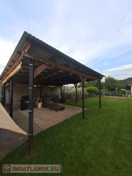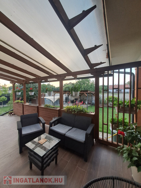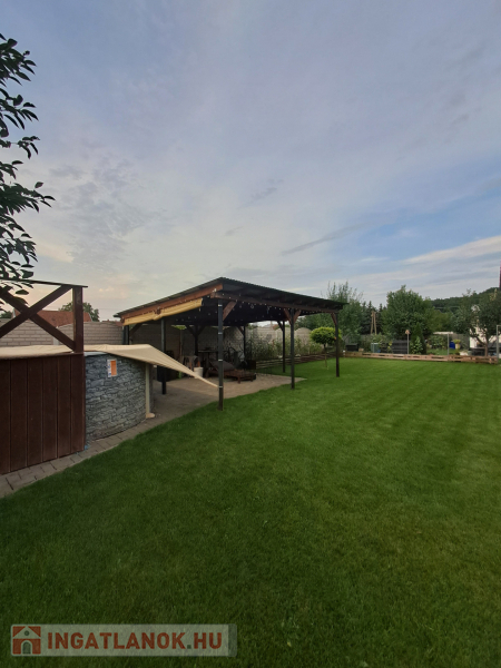 430 m² teljesen parkosított kert automata öntözőrendszerrel , örökzöldekkel, filagóriával, magas ágyással, ellenáramoltatós, hőgenerátoros 3,5 méter átmérőjű, medencével,