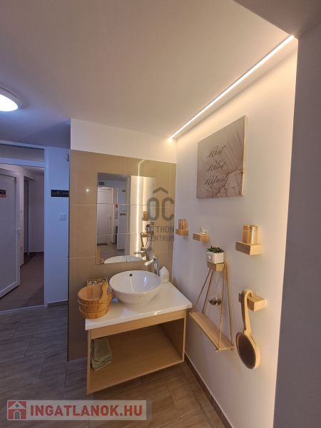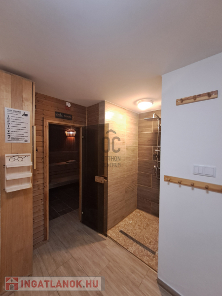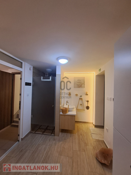 wellness részleg a pinceszinten:egy gerenátorral működtetett sóbefúvókkal felszerelt sóbarlang, egy 12 személyes újszerű állapotú finn szauna, két zuhanyzó, öltözők és két vendégwc, fűtött tepidárium ( kőpad) és pihenőrészleg.