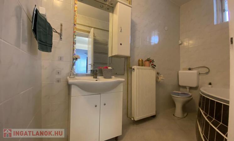 A fürdőszoba ablakos, sarokkádas, WC-vel egyben kialakított.