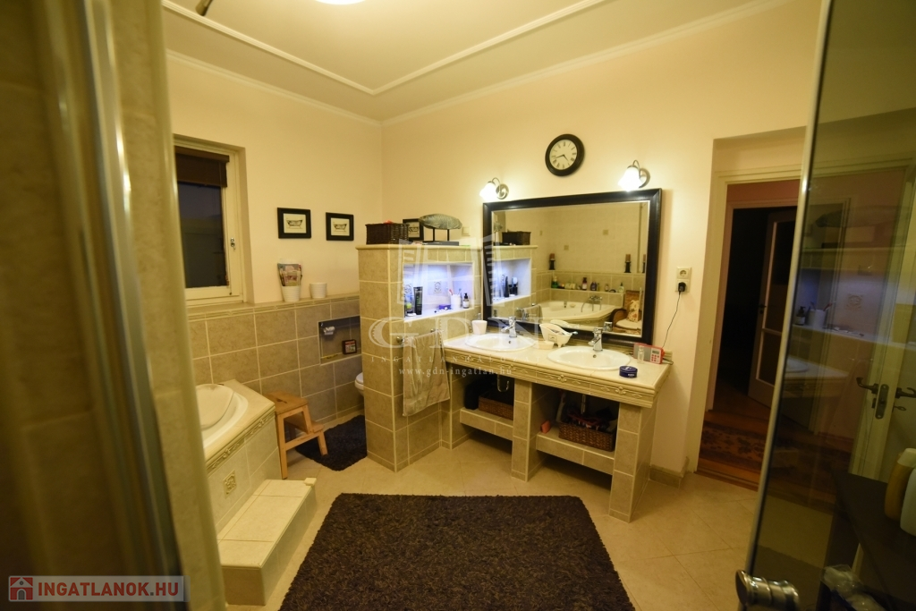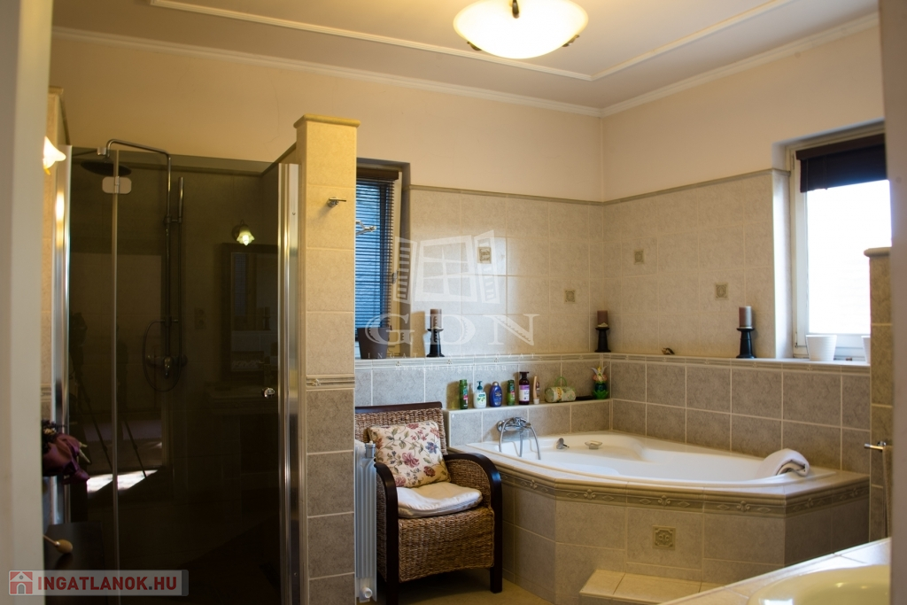 További jellemzők: fúrt kút, 30 nm kerékpártároló, szerszámtároló, utcafronthoz képest magasabb fekvés, 10 cm szigetelés, 10 éves burkolatok, rózsafa parketta, 3 cm antikolt mészkő teraszburkolat, cirkó fűtés padlófűtéssel kombinálva.