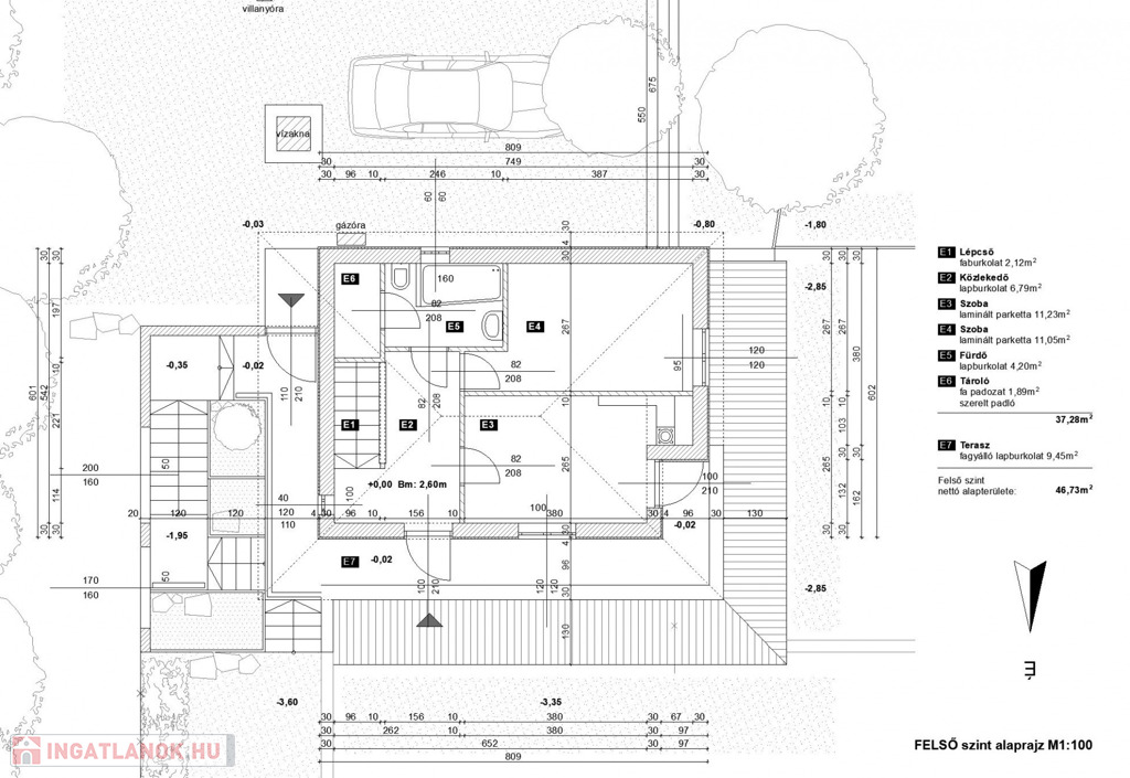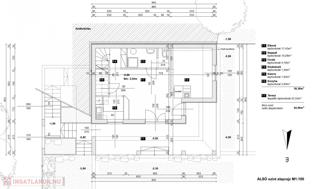 - helyiségek alsó szinten: közlekedő, konyha, étkező, nappali + terasz kapcsolattal, wc, fürdőszoba,