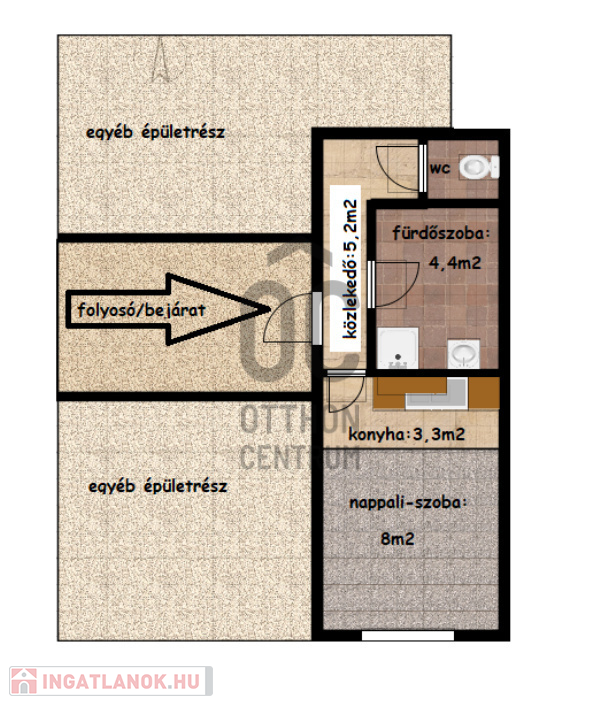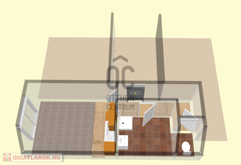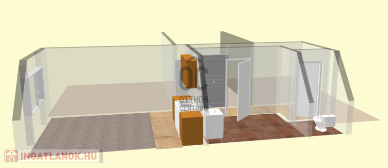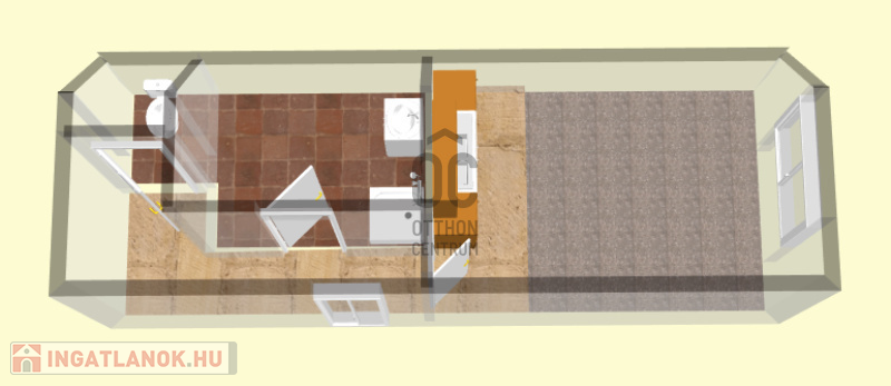 A lakásban szoba-konyha egyben található, a főzés infra főzőlappal megoldott, hűtőszekrény rendelkezésre áll.