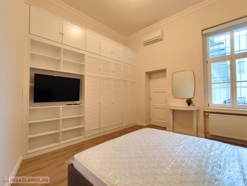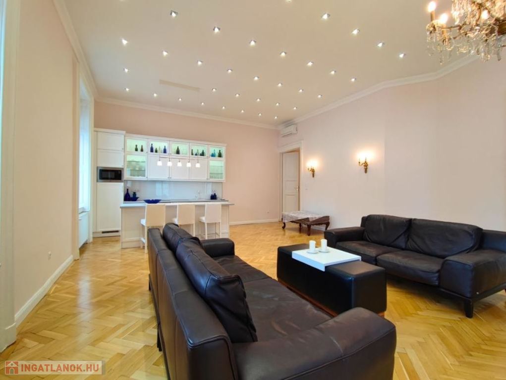Kiadó HOSSZÚTÁVRA Budapest Belvárosában, a Veres Pálné utca egyik legszebb házának a III.emeletén egy TELJESKÖRŰEN FELÚJÍTOTT, 125 nm-es, amerikai konyhás + nappalis, 2 hálószobás, 2 fürdőszobás, igény szerint bútorozott, gépesített, légkondicionált, világos, erkélyes lakás.