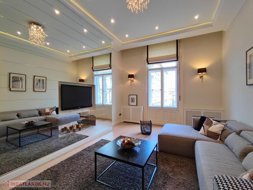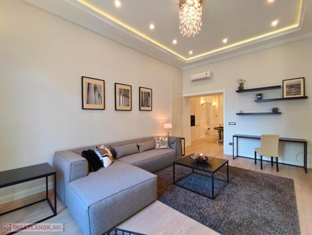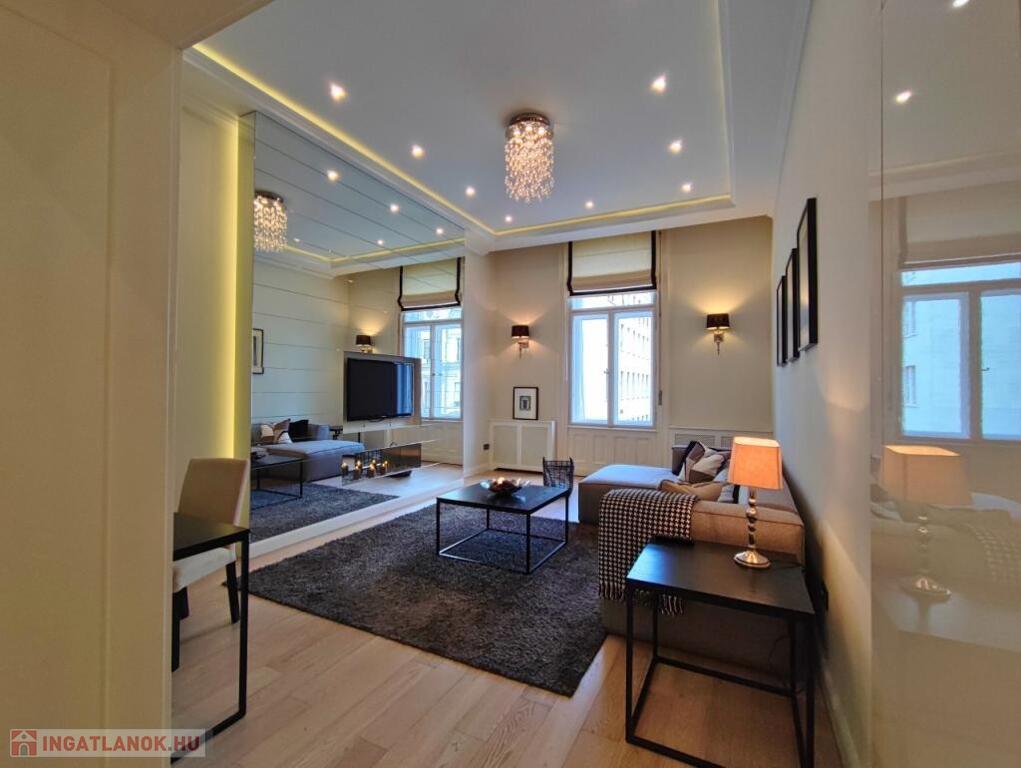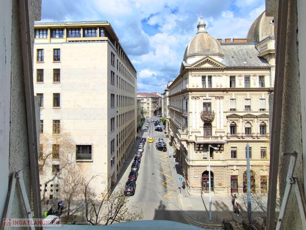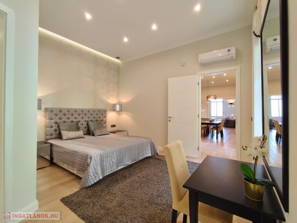 Kiadó Budapest, V.ker. Aulich utcában - a Szabadság tér közelében - rendezett liftes ház 3. emeletén egy 80 nm-es, 2 hálószobás, LÉGKONDICIONÁLT, RIASZTÓS, lakberendező által berendezett, gépesített, VILÁGOS lakás.
