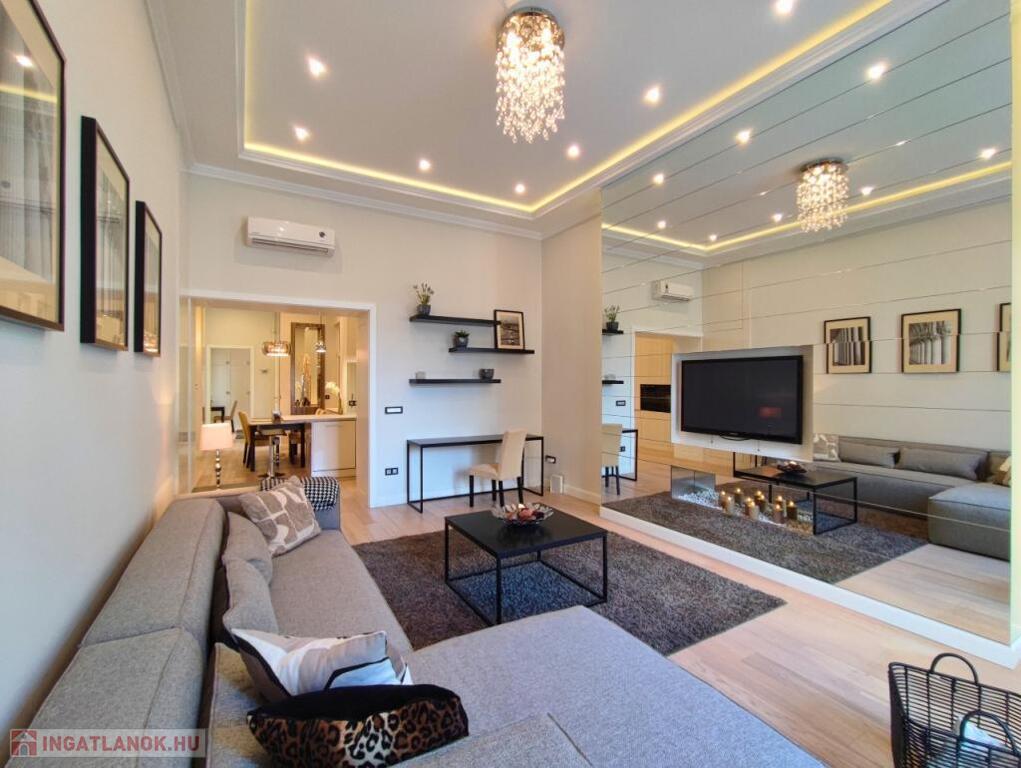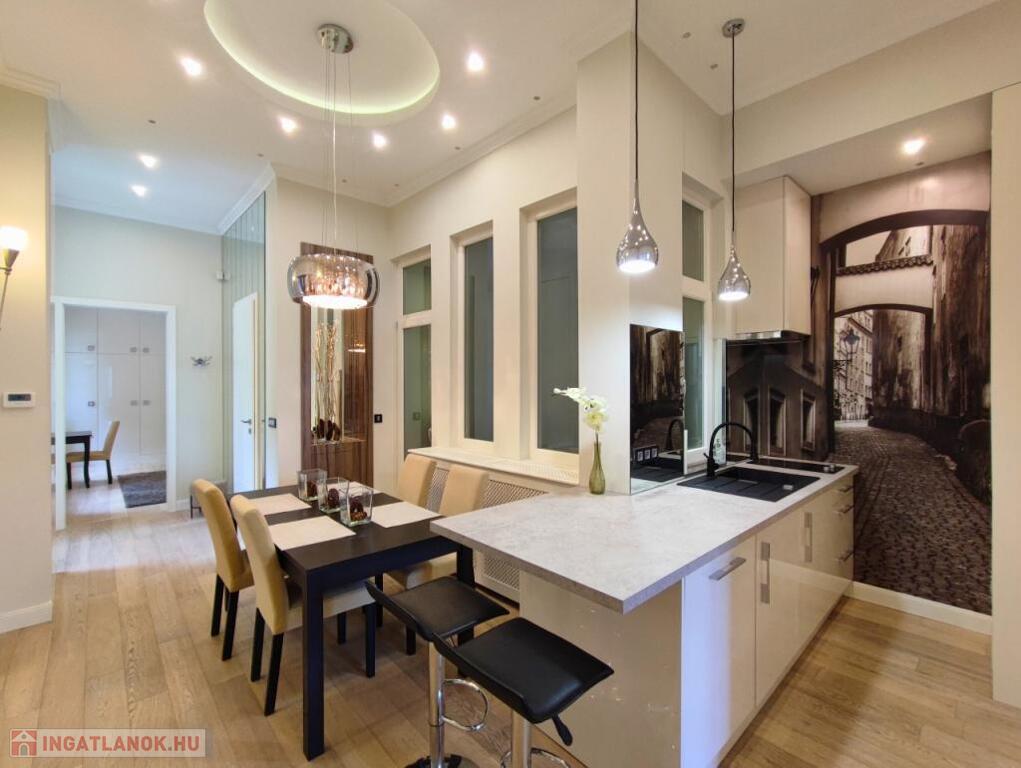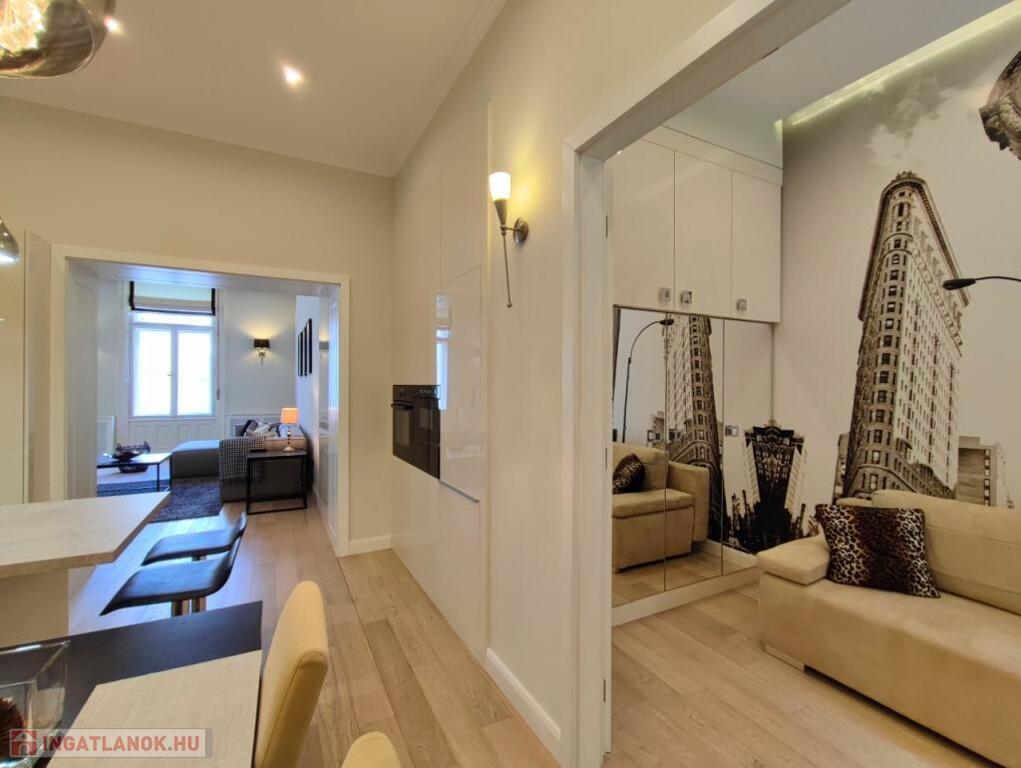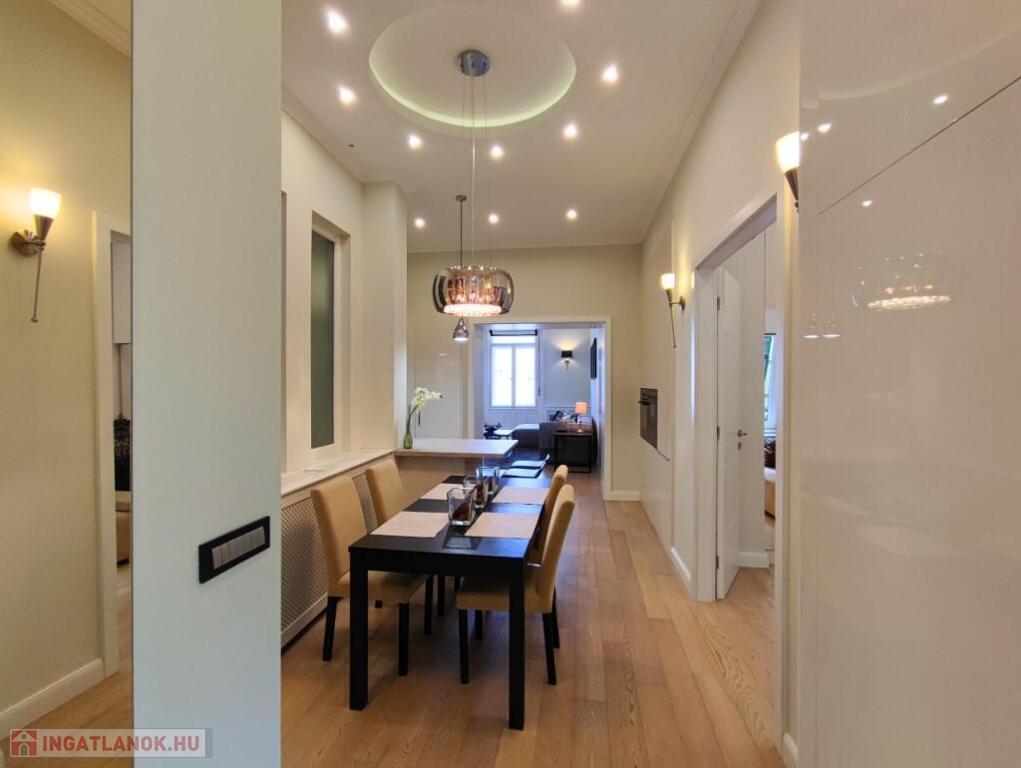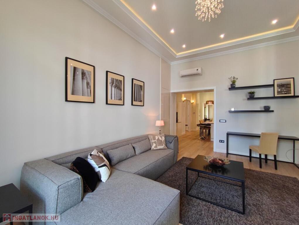 Kiadó Budapest, V.ker. Aulich utcában - a Szabadság tér közelében - rendezett liftes ház 3. emeletén egy 80 nm-es, 2 hálószobás, LÉGKONDICIONÁLT, RIASZTÓS, lakberendező által berendezett, gépesített, VILÁGOS lakás.