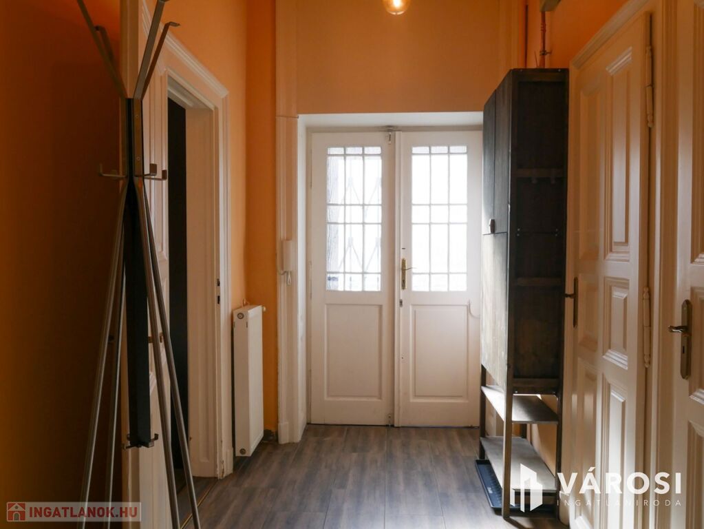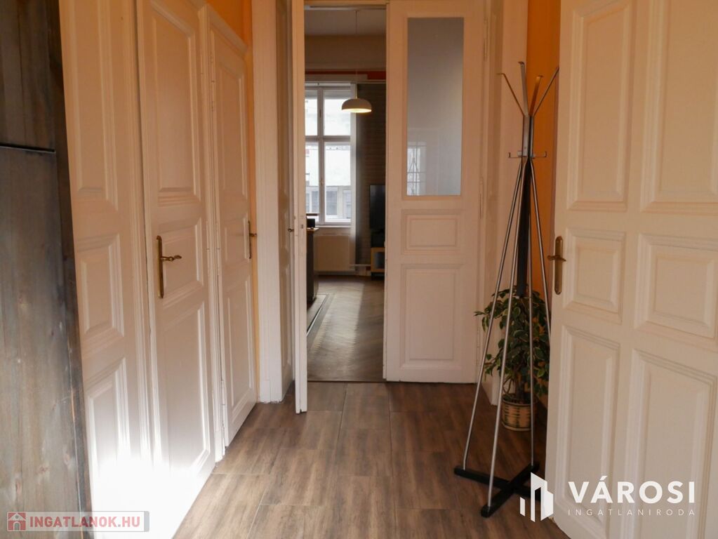 Az első emeleti lakás belmagassága 3,82 m, amely elegáns és tágas érzetet kelt. Az amerikai konyhás nappali kényelmesen berendezett, ablakai az utcára néznek. A hálószoba csendes, hangulatos, belső körgangra néző. Külön helyiségben van a zuhanykabinnal ellátott fürdőszoba, a WC és egy tároló. A lakás gépiesített, megtalálható benne hűtőszekrény, sütő, tűzhely, mosogatógép, a megfelelő hőmérsékletről pedig a radiátorok mellett klíma is gondoskodik. Egyedül a mosógép nincsen még beépítve, de kérés esetén ez pótolva lesz.
