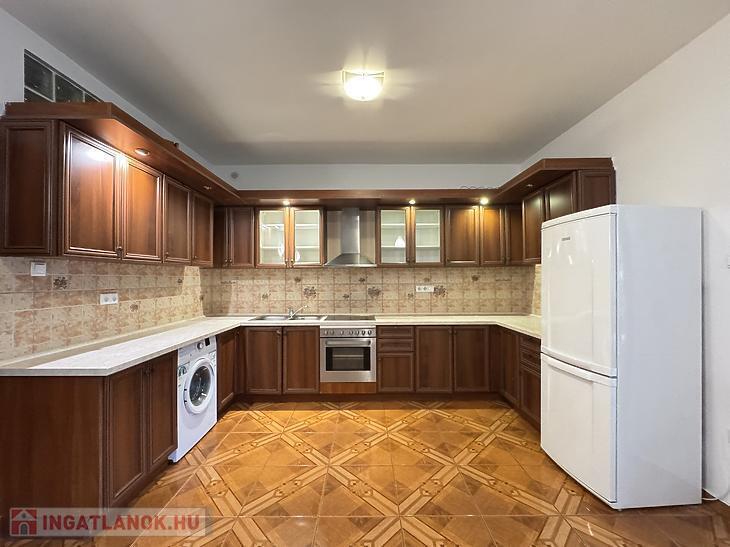 Nem bútorozott, de gépesített: beépített sütő és főzőlap, valamint a hűtő és mosógép.
