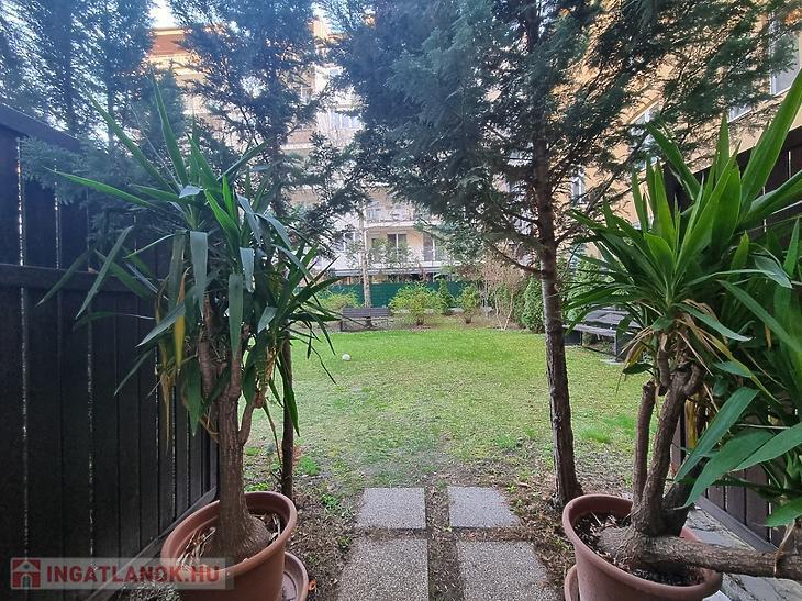 A házhoz zöld, nyugodt közös kert tartozik – ideális pihenéshez egy hosszú nap után
