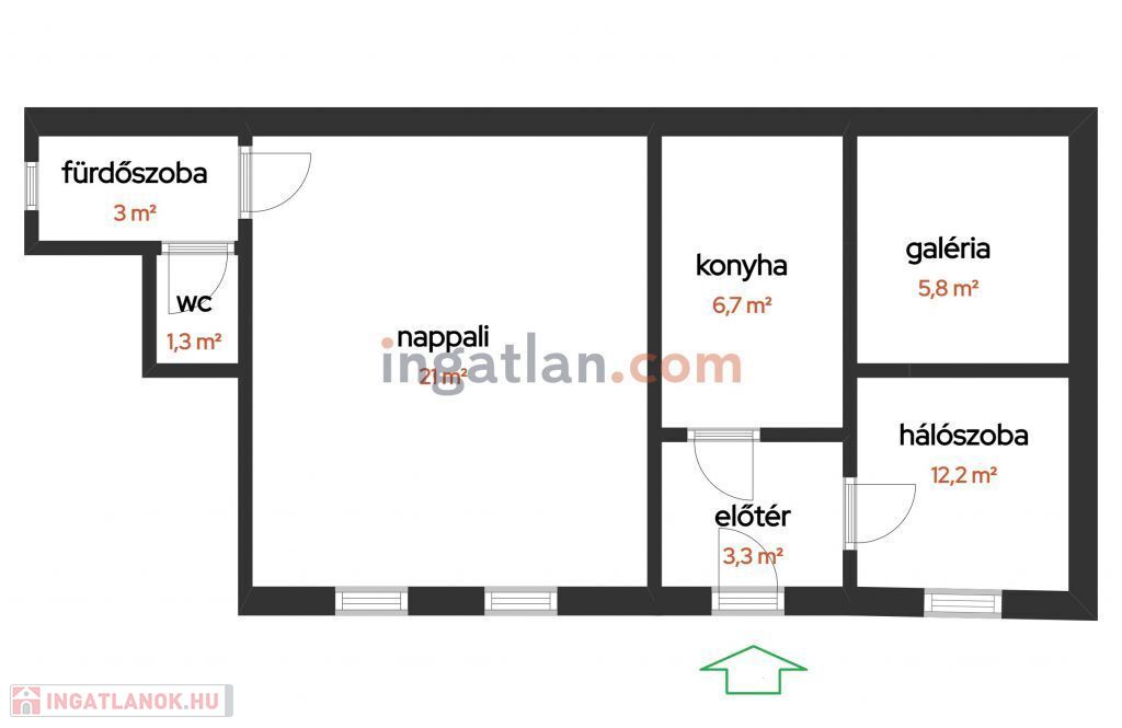 nappali (21 nm), konyha (6,7 nm), hálószoba (12,2 nm), galéria (5,8 nm), előszoba (3,3 nm), fürdőszoba (4,3 nm).