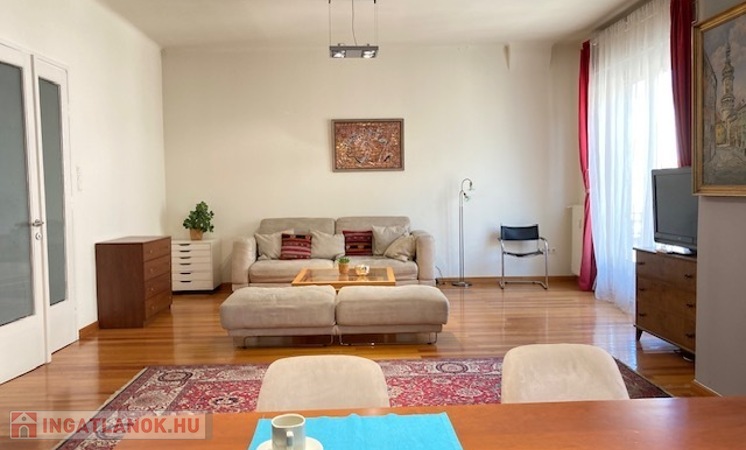 A bright and quiet 83 sqm, 2-room apartment with open-plan kitchen and balcony is available for long-term rent in Budapest’s 5th district, close to the Danube.