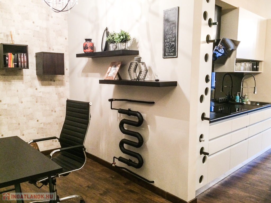A lakás elrendezése: tágas amerikai konyhás nappali, külön nyíló hálószoba, gardróbhelyiség, dolgozósarok, valamint igényes, külön fürdőszoba.