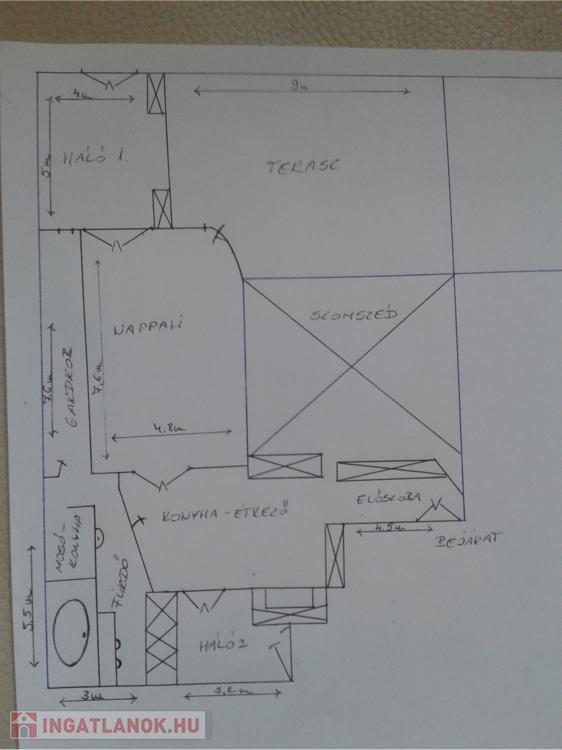 Helyiségek: előszoba, nappali, háló, félszoba, étkezőkonyha, fürdő, gardrób, mosókonyha, terasz