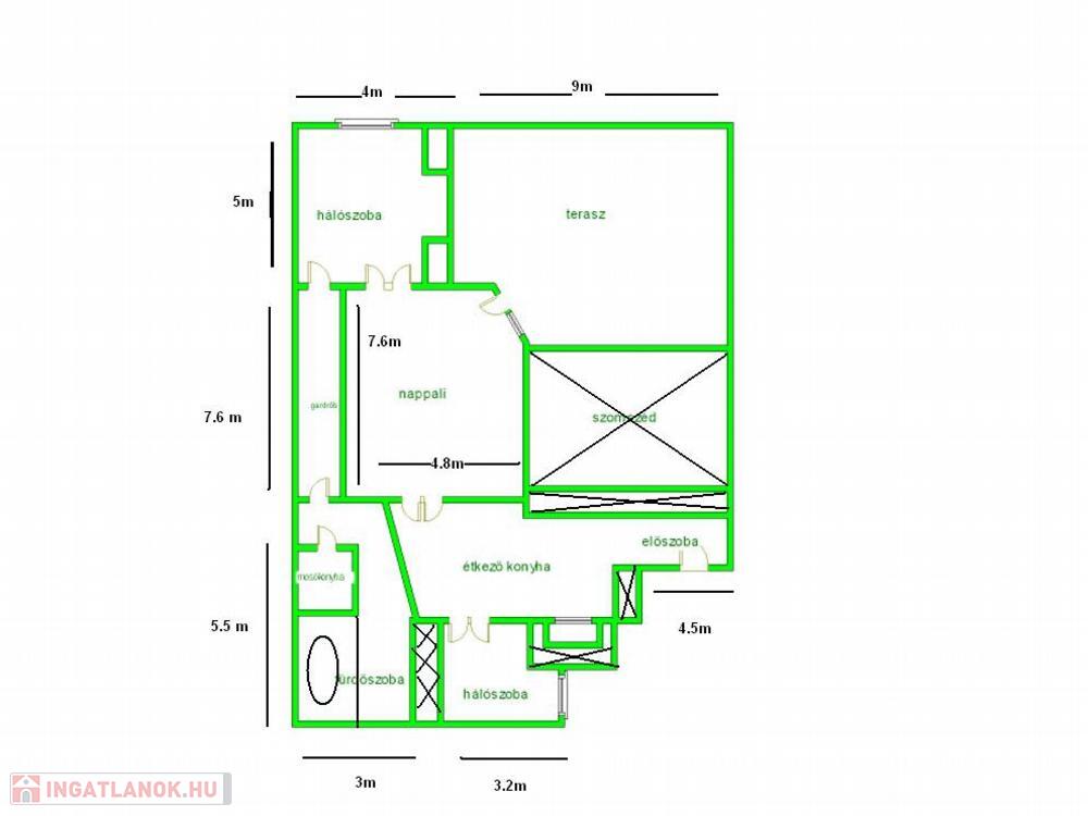 Helyiségek: előszoba, nappali, háló, félszoba, étkezőkonyha, fürdő, gardrób, mosókonyha, terasz