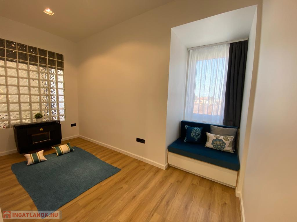 A nappaliból elérhető hálószoba nyugodt, csendes légkört biztosít, a hozzá kapcsolódó, külön gardróbhelyiség pedig praktikus és stílusos megoldás minden igényes bérlő álma.