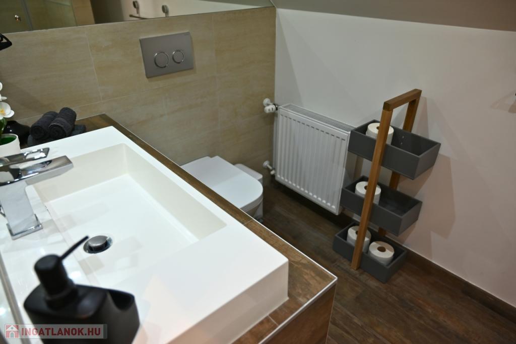 Fürdőszoba: esztétikus burkolatú, zuhanyzós, WC-vel