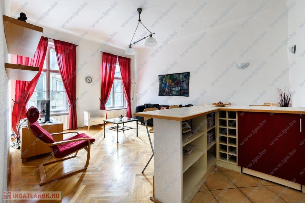 Kiadó 16 nm-es SZOBA Budapest, VI. kerület Hajós utcában minimum 6 hónapra egy szépen felújított 65 m2-es, amerikai konyhás nappalis + 2 hálószobás, utcai nézetű, 2. emeleti lakás.