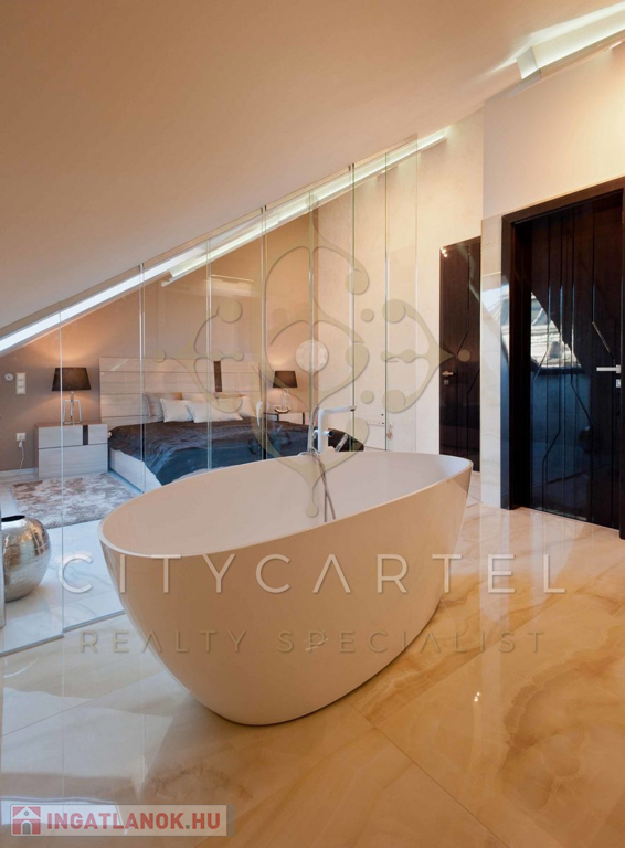 A fürdőszobákban Valentino és La Fabrica burkolatok, valamint Duravit és Grohe szaniterek találhatók. Az egyedi tervezésű bútorok és törölközőszárítók tovább növelik az exkluzivitást, az egyik fürdőszobában pedig egy Ravak hidromasszázs kád biztosítja a pihenés élményét.