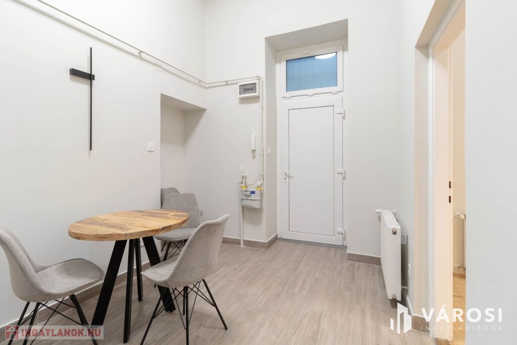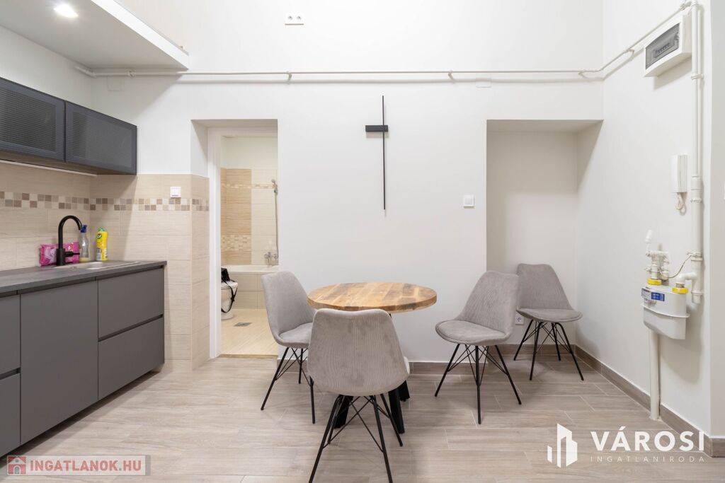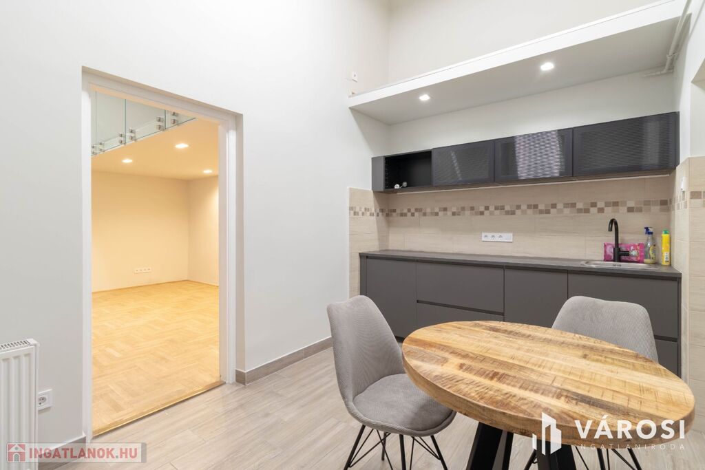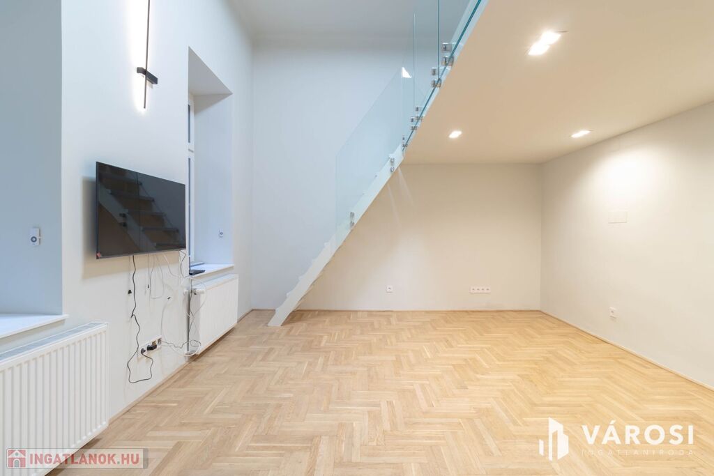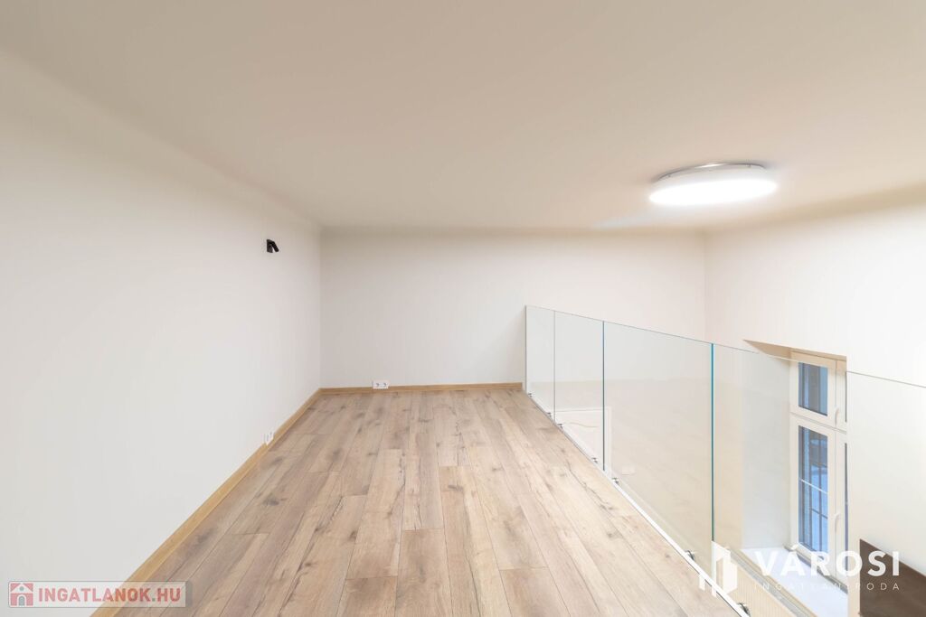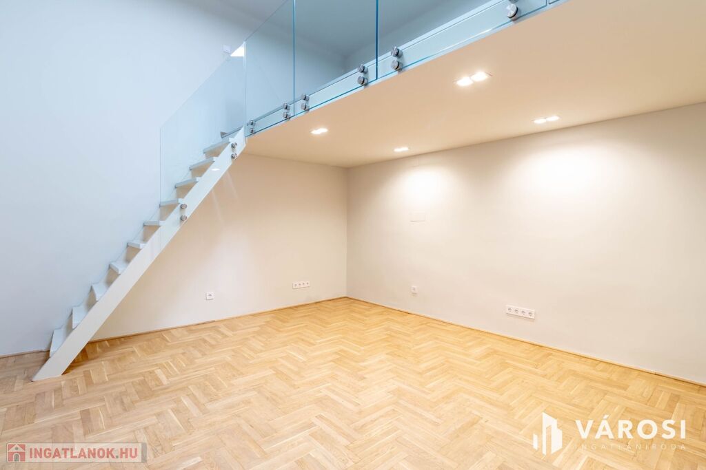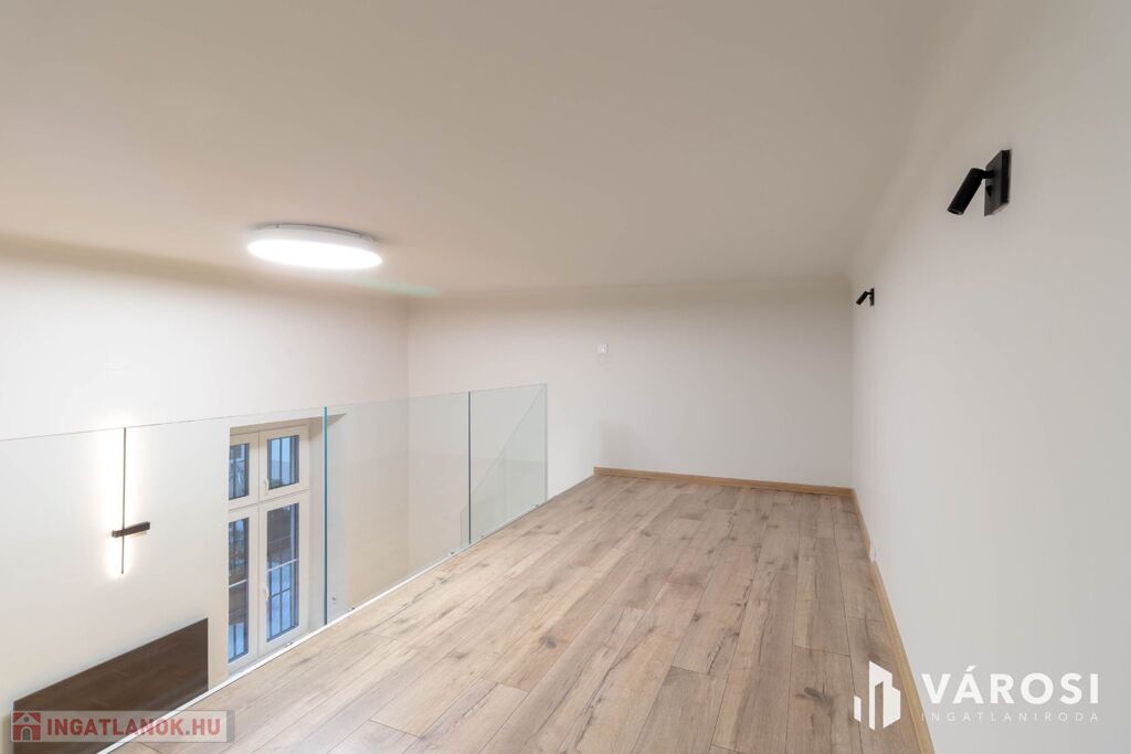 Az ingatlan alapterülete 36 m2, azonban a 20 m2-es szoba a nagy belmagasságnak köszönhetően kapott még egy 10 m2-es, elegáns megjelenésű álló galériát is, mely növeli a használható teret és lehetőséget ad egy, a nappalitól elkülönített hálószoba kialakítására.