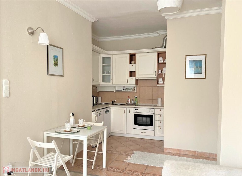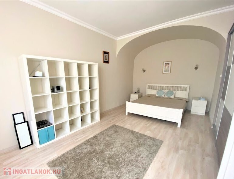 rendezett, liftes, folyamatosan karbantartott ház V.emeletén, egy 65 nm-es, amerikai konyhás nappalis, 2 hálószobás (külön nyílóak) bútorozott, gépesített (mosogatógép, mosógép, hűtő, stb.), belső kertre néző lakás.