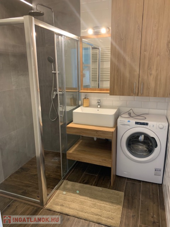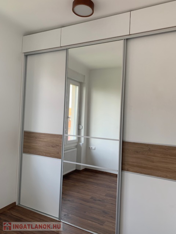 A lakás csendes-világos, gépesített, részben bútorozott, de hatalmas beépített szekrényekkel rendelkezik.