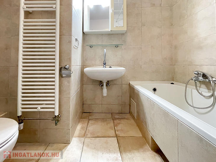 Az ingatlan egy szobás, kádas fürdőszobával és kamrával rendelkezik, illetve több beépített ruhásszekrény is található a lakásban.