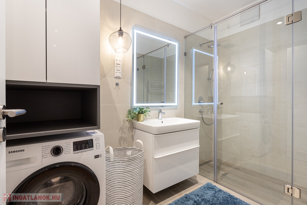 A lakásban 3 rétegű nyílászárók, hőszivattyús hűtés-fűtés, prémium burkolatok és bútorok kerültek beépítésre. A lakás teljesen gépesített (sütő, mikró, hűtő, TV, mosogatógép) és bútorozott.