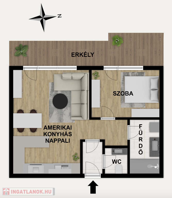 Az 52 m2-es ingatlanban amerikai konyhás nappali, hálószoba, fürdőszoba, külön WC és egy 12 m2-es erkély található.