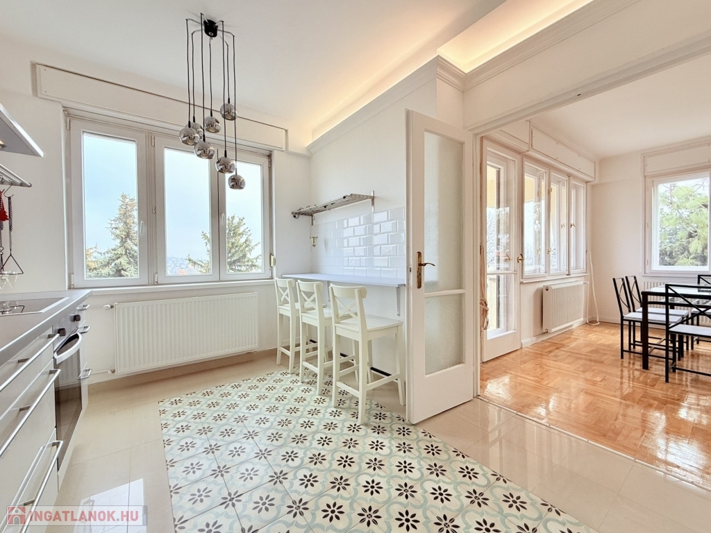 XII. KISSVÁBHEGY egyik legkedveltebb csendes mellékutcájában, a Kis-Sváb-hegy Természetvédelmi Terület és a Városmajor park között, néhány perc sétára a tömegközlekedéstől, LEGFELSŐ emeleti, 78 nm hasznos alapterületű, nappali + két hálószobás, keleti fekvésű, TELJESEN felújított, BÚTOROZOTT lakás, rózsadomb felé néző panorámás terasszal, tárolóval kiadó!