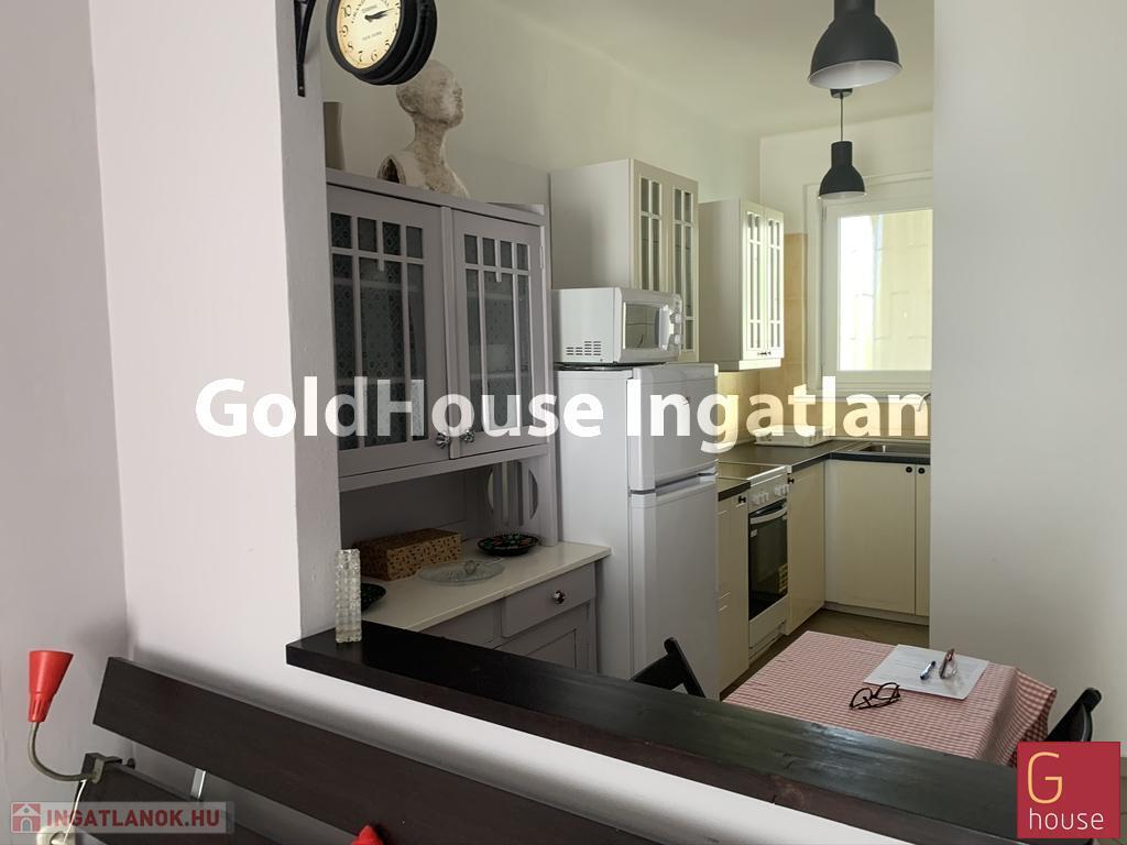 Az előtérből nyílik a modern, gépesített konyha, ahol egy kis étkezős pult is helyet kapott. Innen érhető el a világos szoba francia erkéllyel.