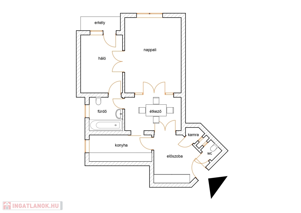 A lakás elrendezése: előszoba, különálló konyha, étkező, nappali, 1 hálószoba, WC, fürdőszoba, erkély.