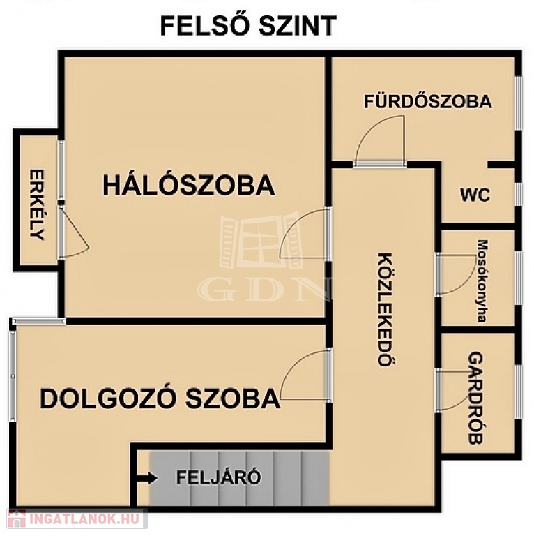 A nappaliból kényelmes, egyedi fénytechnikával felszerelt lépcső vezet fel a felső szintre, ahol egy erkélyes hálószoba, egy dolgozó-, vagy vendégszoba, mosókonyha, gardróbszoba,kádas fürdőszoba és WC található.