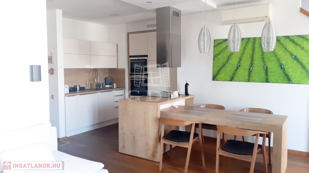 Az alsó szinten egy SIEMENS gépekkel ellátott, magas minőségben bútorozott és jól felszerelt konyha és a hozzá illeszkedő hangulatos ebédlő található.