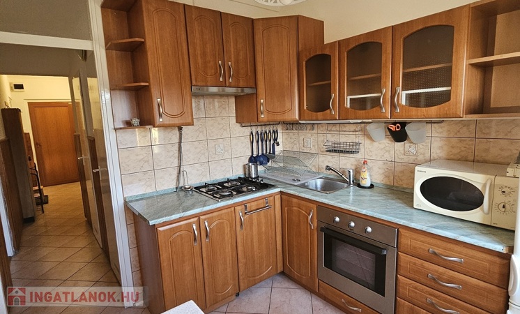 A lakás berendezve kiadó, a konyha teljesen gépesített (légkeveréses sütő, gázfőzőlap, mikró, hűtő, mosógép).