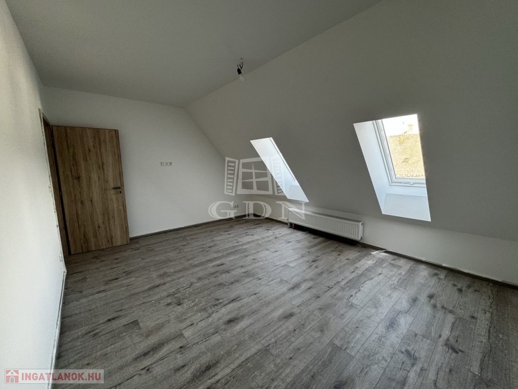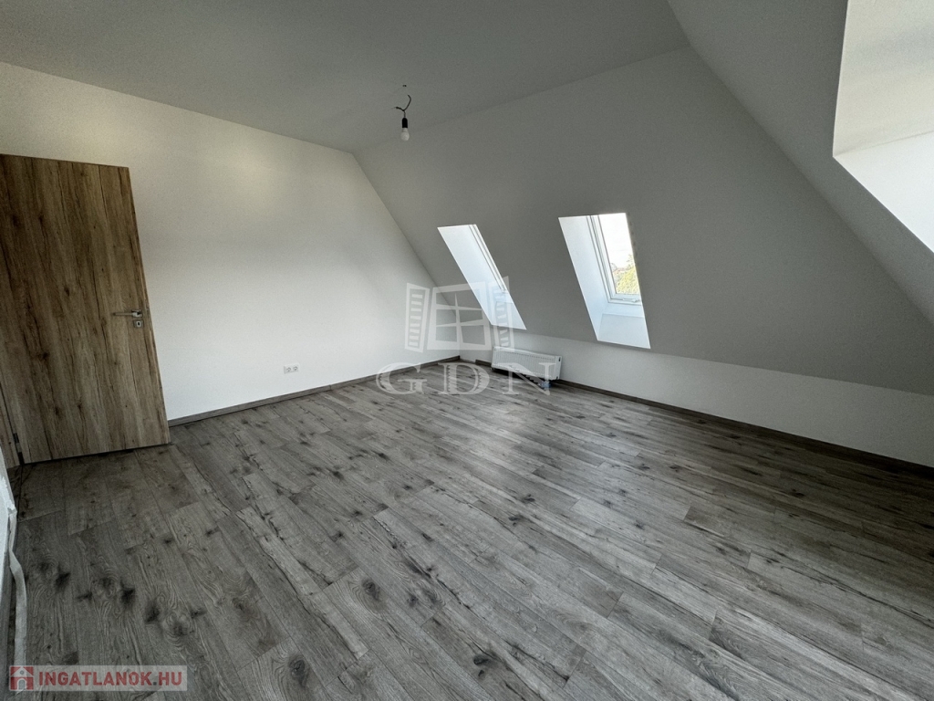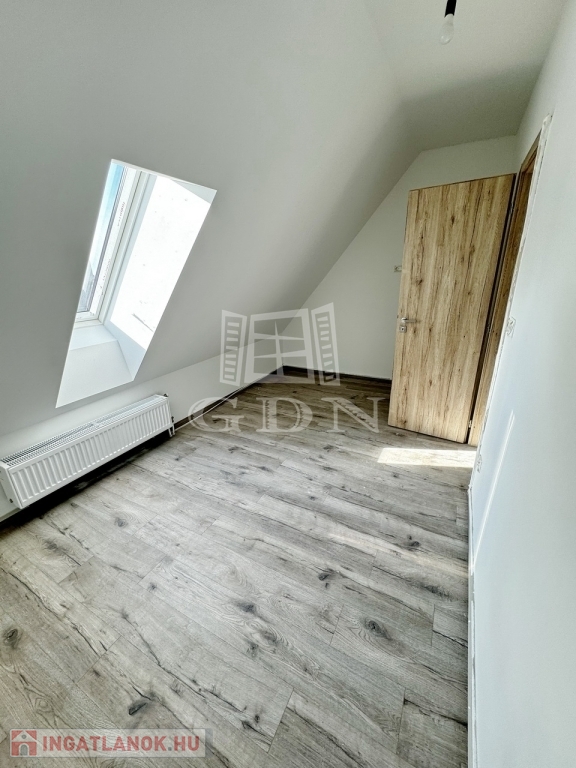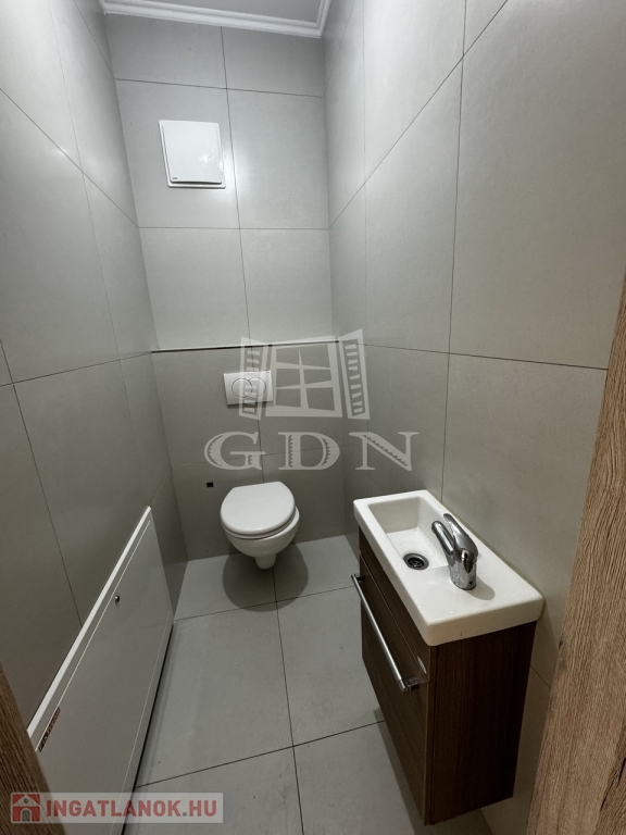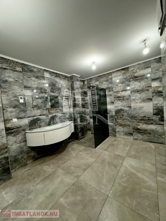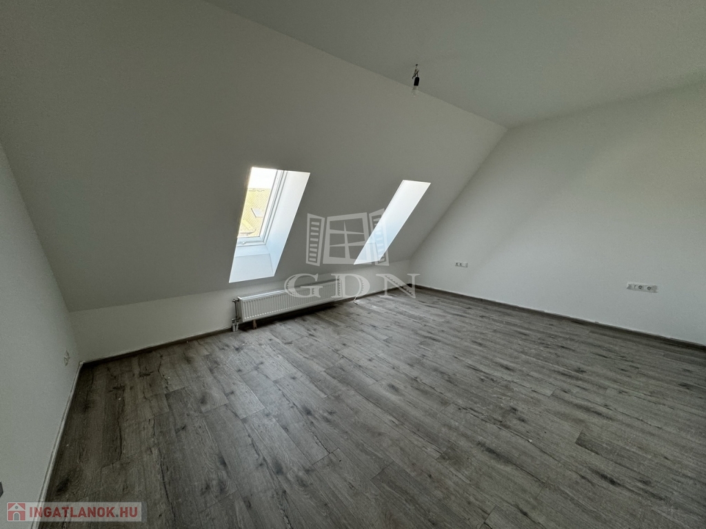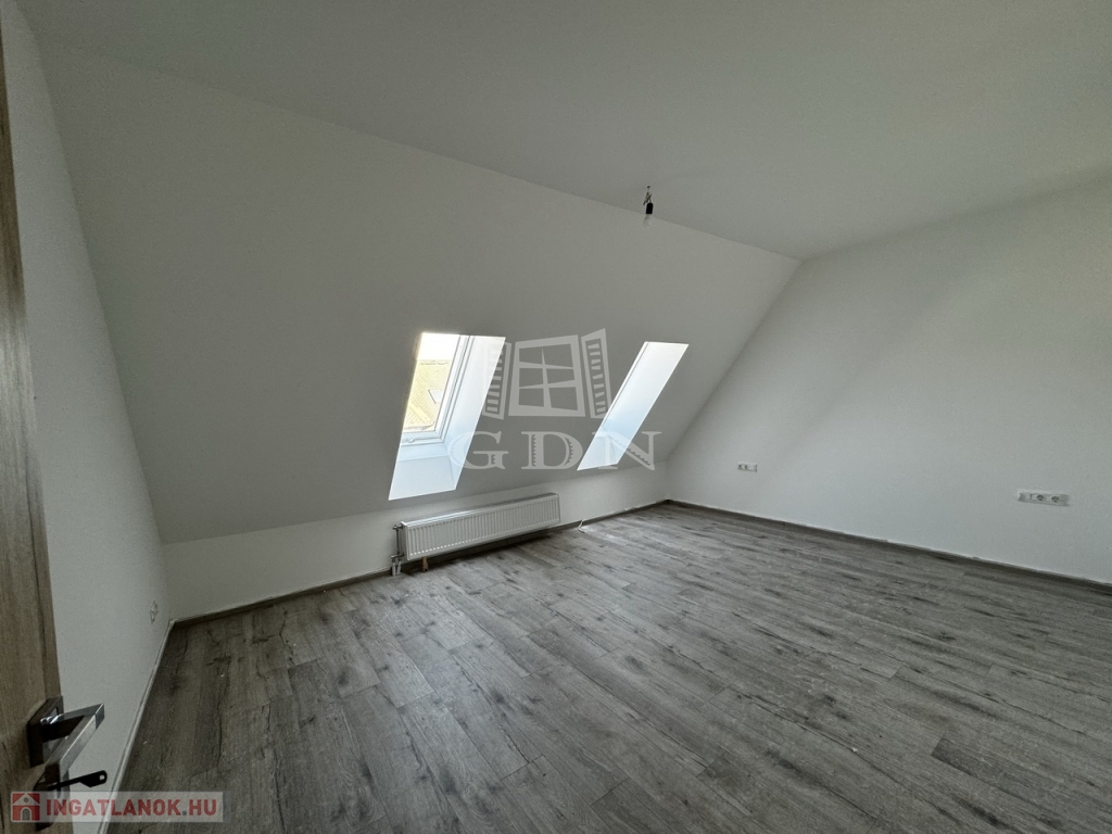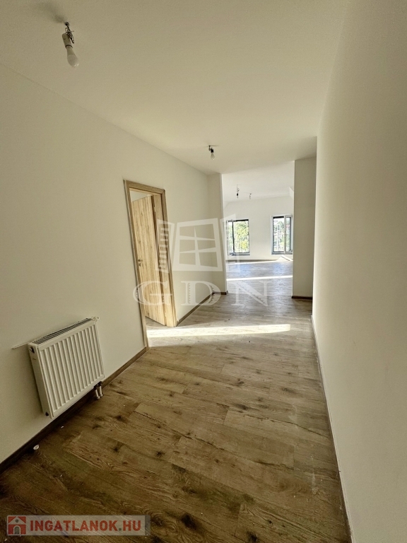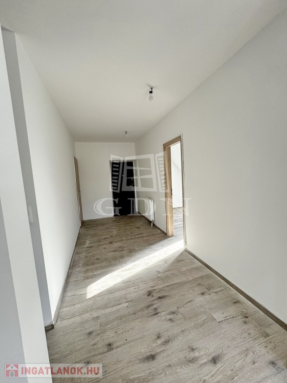 A 120 nm-es lakás egy újépítésű, háromszintes társasház 2. emeletén található, és új lakóját várja. Belépve tágas előtér fogad, innen nyílik a külön WC és az egyik hálószoba, szemben pedig a világos, amerikai konyhás nappali. A közlekedőből jobbra haladva érjük el a fürdőszobát és a további két hálószobát. A fürdőt járólap, a többi helyiséget parketta borítja.