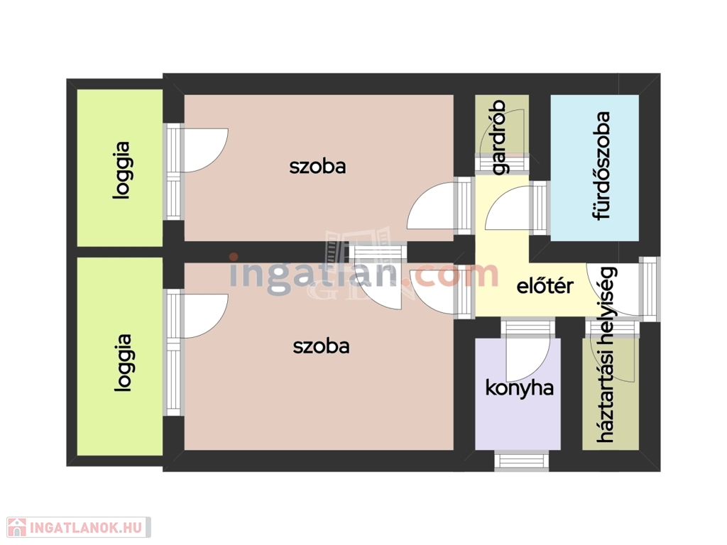 szoba, szoba, hall, fürdőszoba-wc, konyha-étkező, közlekedő-előtér, kamra, gardrób;