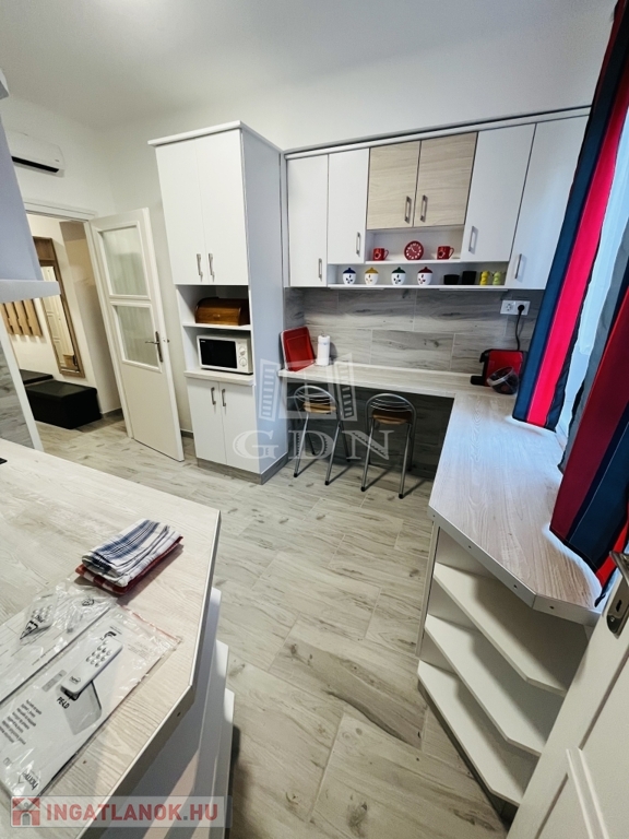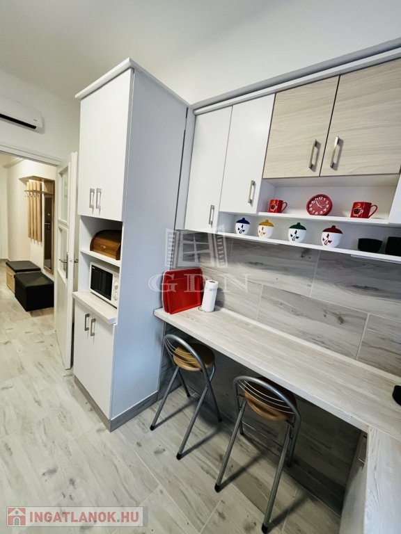 A konyhában új, még garanciális indukciós főzőlap, valamint mikró, hűtő-fagyasztó és mosógép áll a bérlő rendelkezésére. A spejz külön helyiségből nyílik, praktikus tárolási lehetőséget biztosítva.