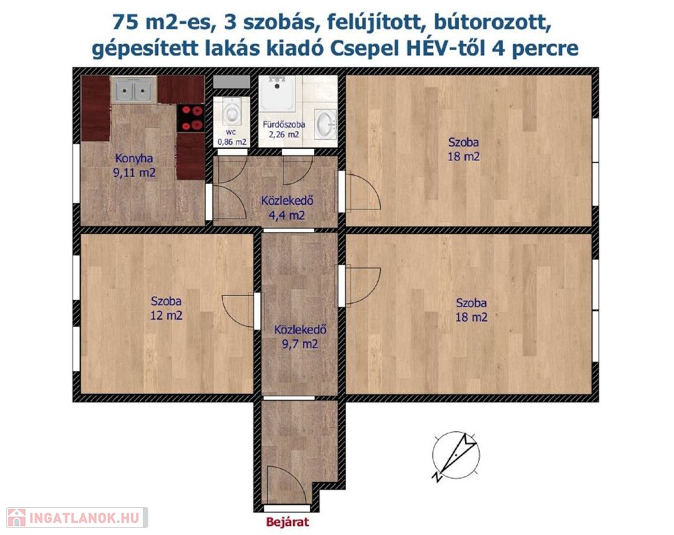 75 M2-ES, 3 SZOBÁS, FELÚJÍTOTT, BÚTOROZOTT ÉS GÉPESÍTETT LAKÁS KIADÓ CSEPEL HÉV-TŐL 4 PERCRE