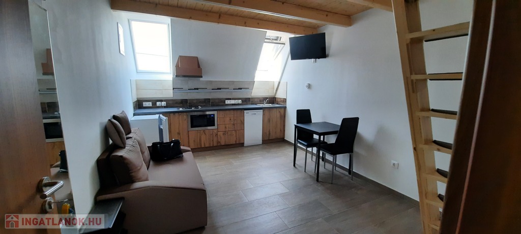 A tetőtéri lakásban a konyha teljesen felszerelt, mosogatógép, mikró, 2 lapos gáz. Az asztal, székek, hűtő, TV .