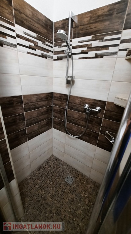 A fürdőszoba zuhanyzós kivitelű, mosógép van.