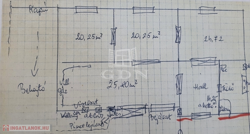 - 3 utcára néző helyiség, 20, 20, 25 nm alapterületűek, köztük 3 szárnyú fa beltéri ajtók,