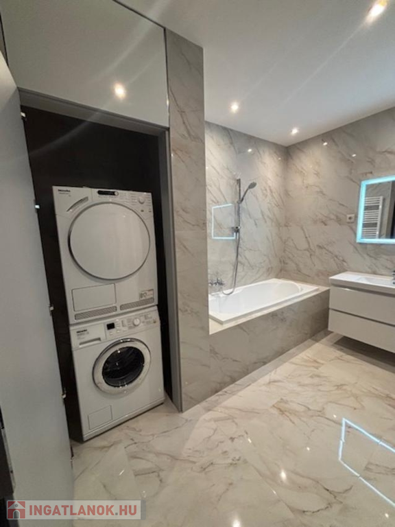 A fürdőszoba ( zuhanyzós és fürdökádas), ahol külön beépített szekrényben "Mille" mosó és szárítógép található! A nyílászárók távirányítós, motoros működtetésű, alumínium redőnnyel felszereltek és szúnyoghálóval ellátottak.