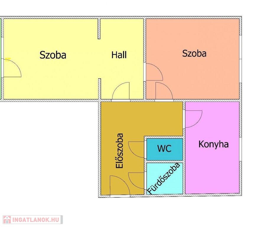 Elosztása: előszoba, fürdő, külön wc, nappali hallal, hálószoba, konyha.