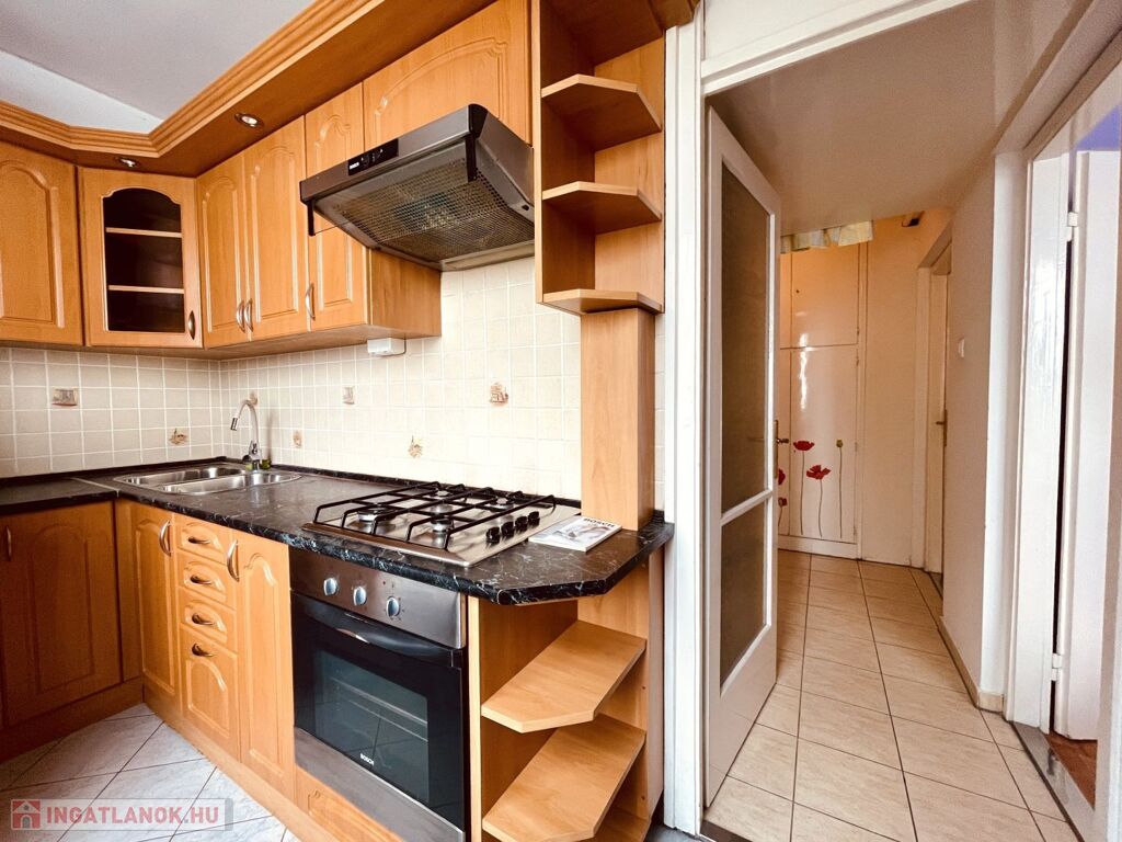 A konyhában új konyha bútor, elektromos sütő, gáz főzőlap, páraelszívó.