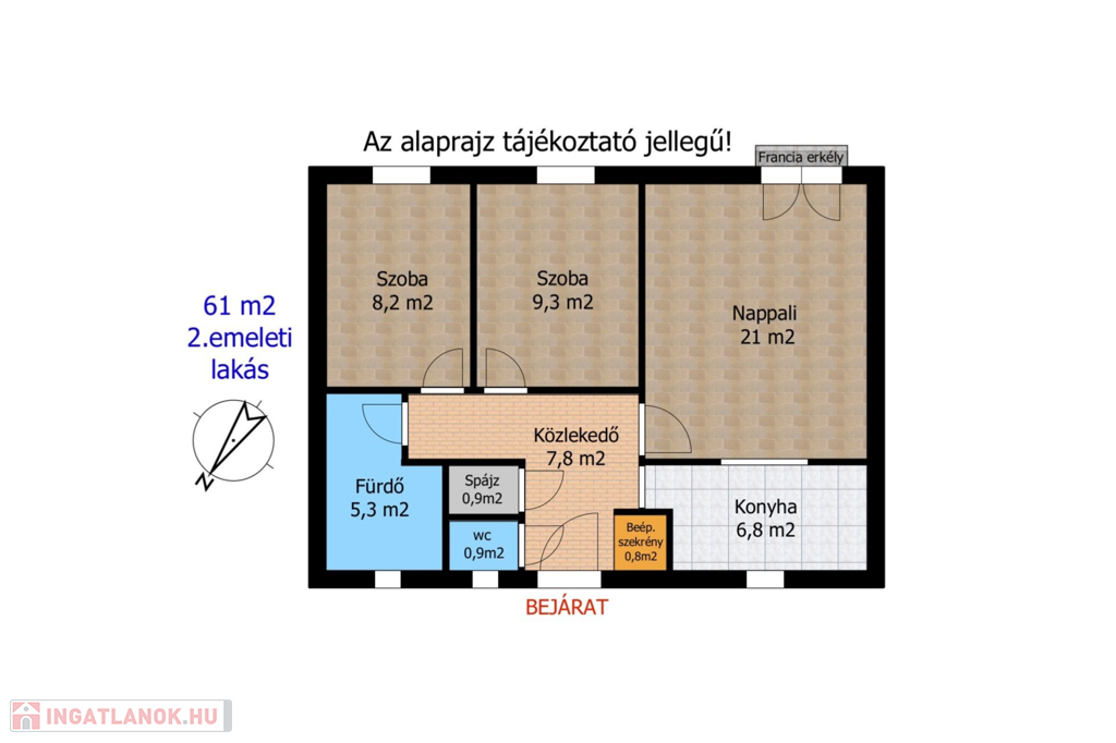 Az udvarra néző nappali + 2 szoba ablakai délkeleti fekvésűek; egyéb helyiségek konyha, spájz, közlekedő, fürdő külön wc, előszobában a bejárat mellett beépített gardrób, műanyag külső nyílászárók.