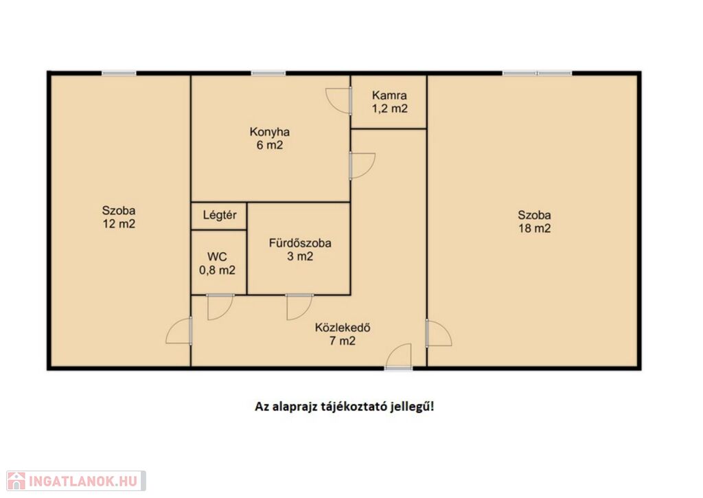 Az ingatlan belső elosztása: közlekedő, 2 szoba, konyha, fürdőszoba, Wc.