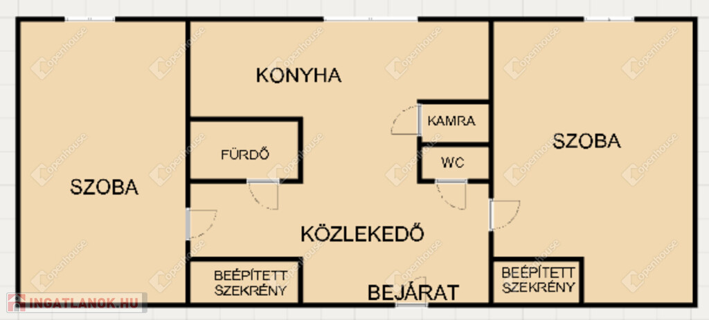 elosztása: előszoba, közlekedő, két külön nyíló szoba, konyha, kamra, fürdőszoba, külön WC