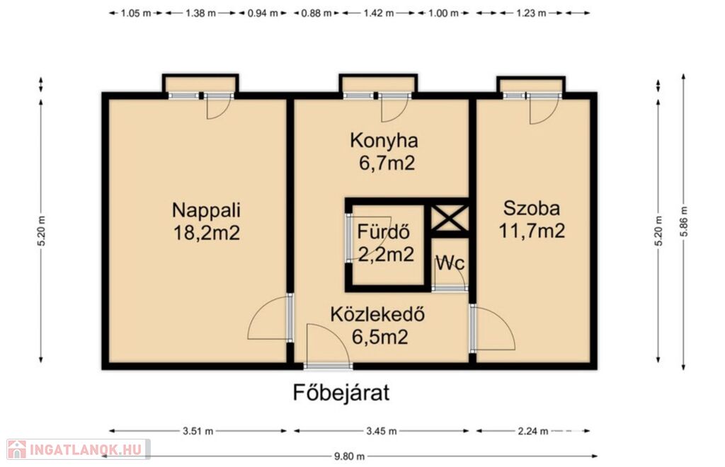 A lakótér: 2 teljes értékű szoba, konyha, fürdőszoba, kamra, közlekedő, mellékhelység.