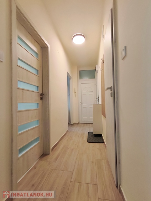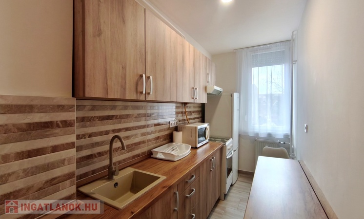 Nyíregyháza Belvárosában, az Északi körúton kiadó egy teljes körűen felújított, 43 m²-es, 1+1 szobás, műanyag nyílászárókkal és redőnnyel szerelt, járólap és laminált burkolattal rendelkező bútorozott, gépesített lakás téglaépítésű társasházban.