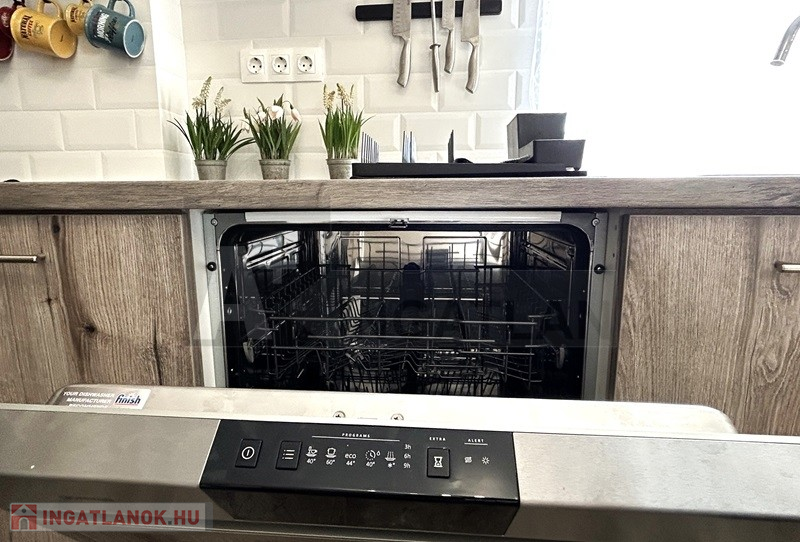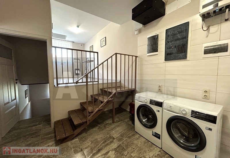 A konyha teljesen felszerelt, gépesített a háztartási helyiségben mosó és szárítógép is van.